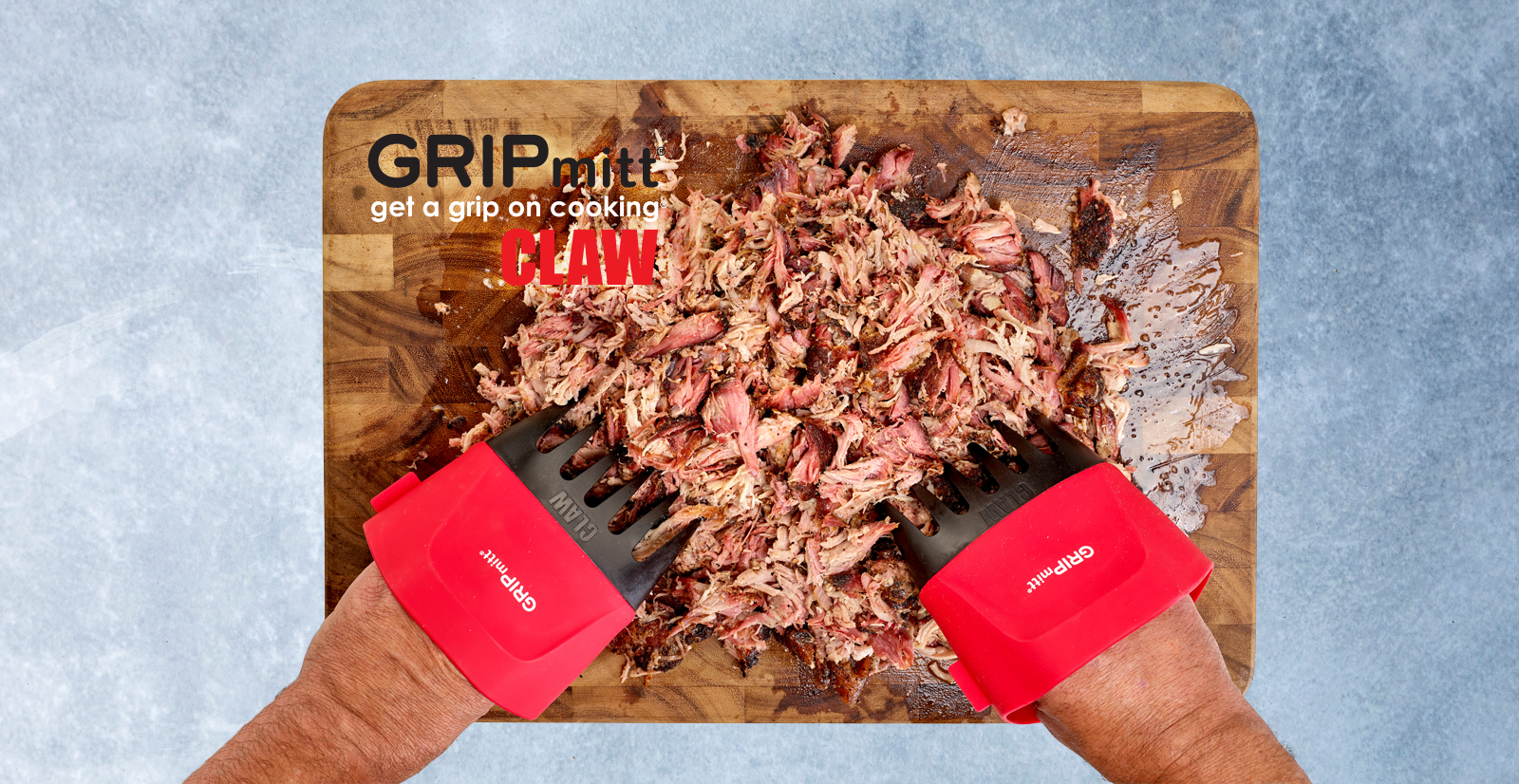 Our Innovative and first-of-its-kind GRIPmitt® CLAW is a game changer in shredding and handling roasted, slow-cooked or smoked meat and in moving food products out of and into pans, BBQ or cutting boards. The integrated silicone sleeves protect your hands from spattering cooking juices and allow for hygienic food handling